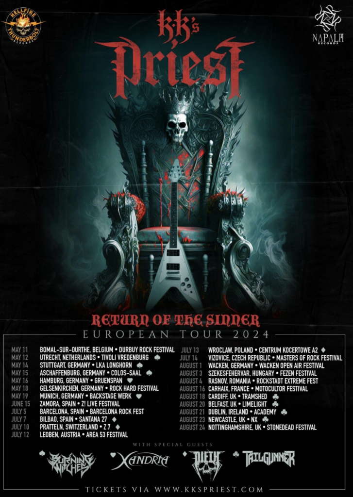 KK’S PRIEST – featuring Judas Priest alumni K.K. Downing (guitar) and Tim “Ripper” Owens (vocals) – are set to launch their very first European headline tour. Joining them will be special guests including Burning Witches, Xandria, DIETH and Tailgunner. Additionally, the band will perform live at major European festivals, including the legendary Wacken Open Air, for the first time!