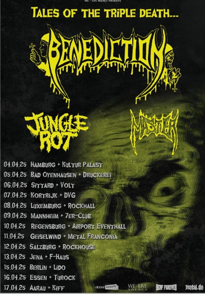 Catch BENEDICTION live on their European release tour in April 2025 with guests Jungle Rot and Master. All confirmed live dates below: